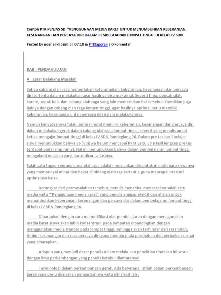 CONTOH PTK Penjaskes SD BAB I. Download ptk penjaskes sd doc Oleh karena itu pendidikan jasmani dan olahraga terus ditingkatkan dan dilakukan dengan kesabaran dan keikhlasan. Berikut adalah Contoh PTK SD Kelas 4 yang sudah dikemas lengkap dan optimal.