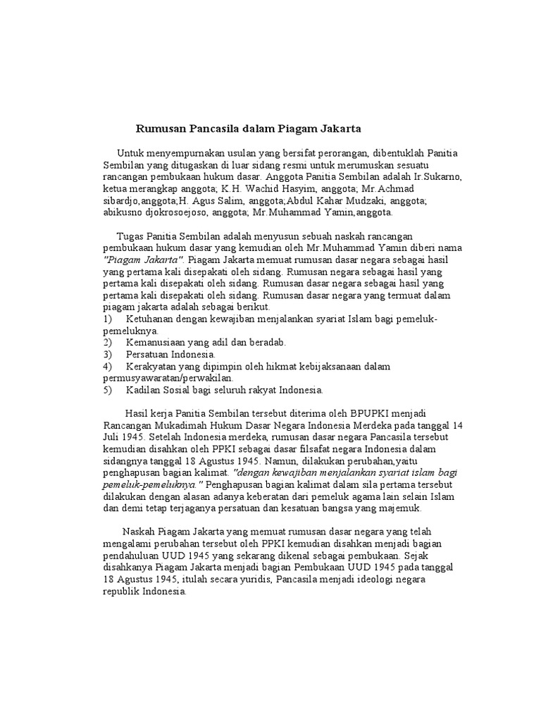 Piagam Jakarta Jakarta Charter adalah teks tertulis yang isinya memuat rumusan dari hukum dasar Negara Republik Indonesia. Perubahan dalam Isi Piagam Jakarta Ketika disahkan Piagam Jakarta kala itu mendapat sambutan hangat. Hari lahirnya Pancasila yang diperingati tiap 1 Juni memang identik dengan gagasan presiden pertama Republik Indonesia Soekarno.