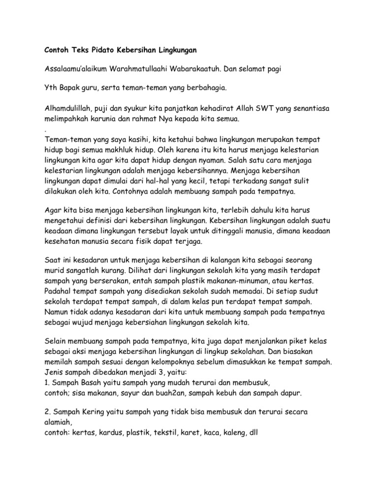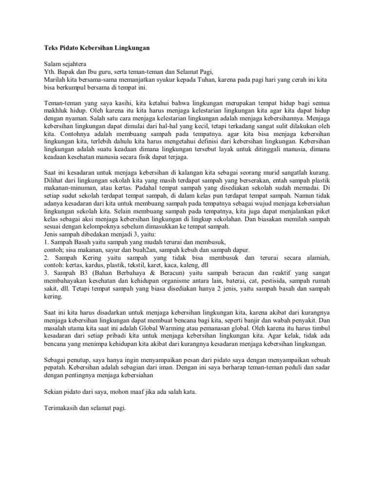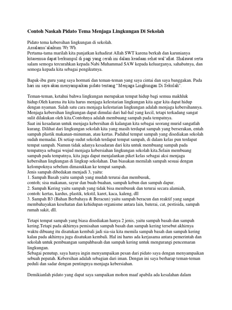 Maka dari itu menjaga kebersihan lingkungan bisa dimulai dari cara menjaga kebersihan diri sendiri. DOC Contoh pidato singkat tentang lingkungan sekolah Dhlie. Yang Saya hormati Bapak Kepala Desa.