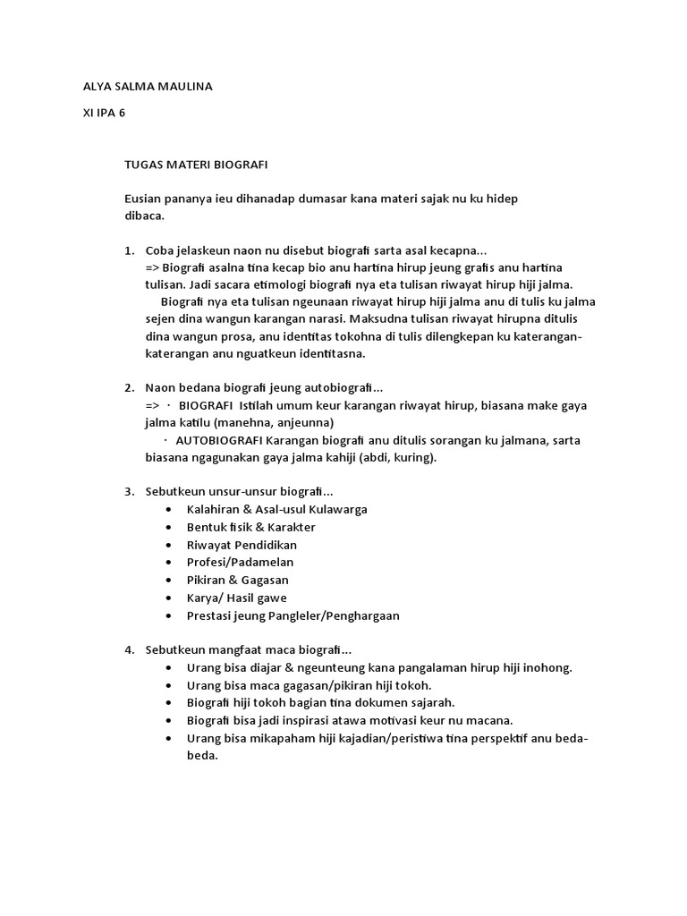 Bedana biografi jeung autobiografi. Berikut soal pertama dan jawabannya. Naon Manfaat Biografi Jeung Otobiografi. Umumnya isi didalam autobiografi ditulis mulai dari masa kanak-kanak sampai keadaan sang penulis saat ini dari yang paling sulit hingga mencapai keberhasilan.