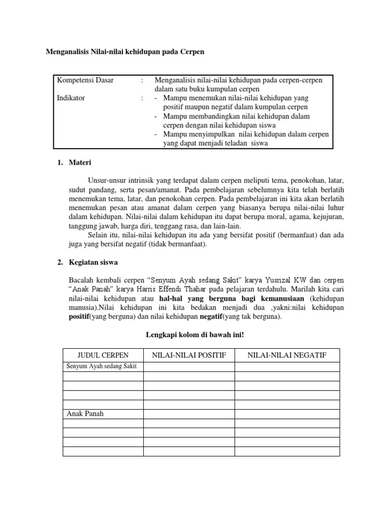 Menganalisis Nilai Nilai Kehidupan Pada Cerpen