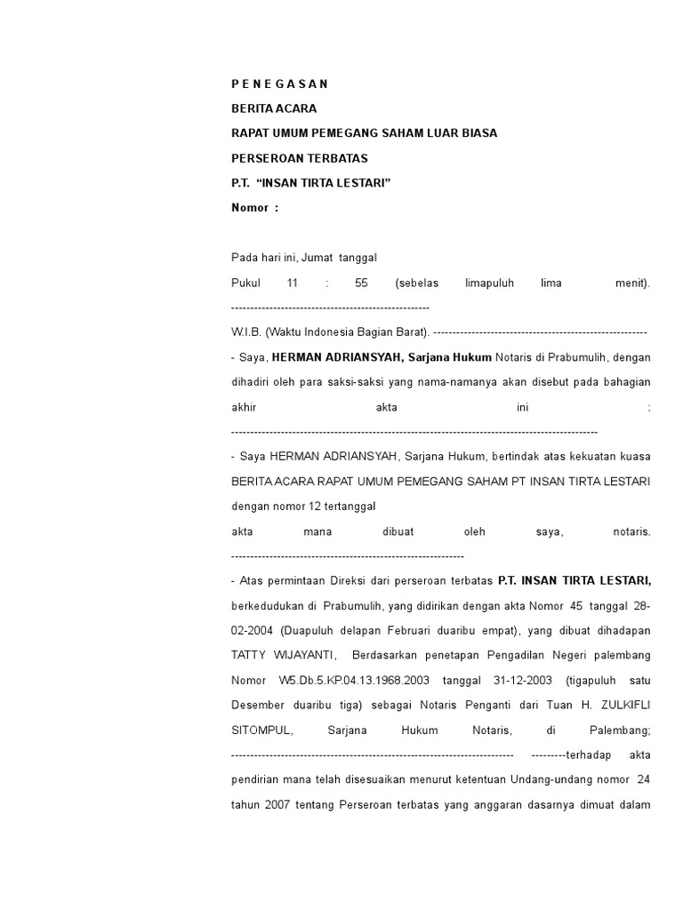 Dan berlakunya perubahan akta tersebut adalah sejak tercatat di. Download Contoh-contoh Akta Notaris Di Bawah Ini. Contoh RUPS perubahan pengurus PT.