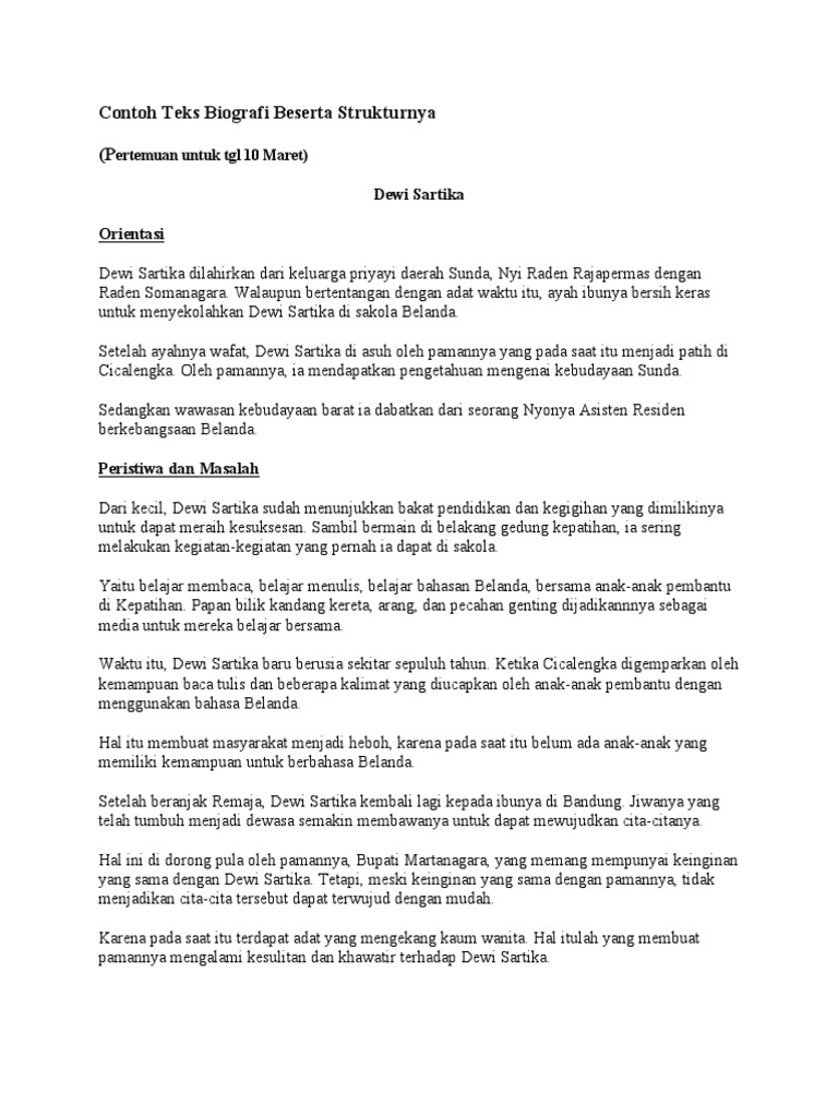 Contoh teks biografi singkat pahlawan beserta strukturnya. Contoh Teks Biografi RAKartini dan Strukturnya 21 Apr 2017 Teks biografi adalah teks yang berisi kisah hidup seseorang yang patut diteladani. Memuat informasi berdasarkan fakta faktual dalam bentuk narasi.
